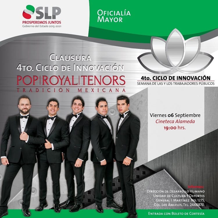 La clausura de este 4° Ciclo de Innovación, estará a cargo de “Pop Royal Tenors”, evento que se llevará a cabo el viernes 6 de agosto en la Cineteca Alameda. Pop Royal Tenors es un concepto mexicano de Ópera Pop integrado por dos tenores, dos barítonos y un bajo profundo. Desde su integración en el 2005, se han presentado en importantes escenarios nacionales y extranjeros, desarrollando espectáculos que combinan la cultura con el entretenimiento.