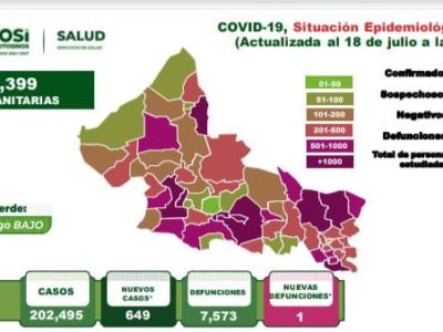 Se reportan 649 casos más de COVID-19 en el estado potosino y una defunción más